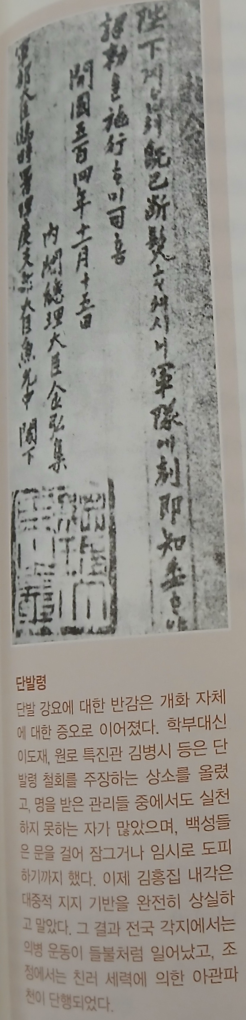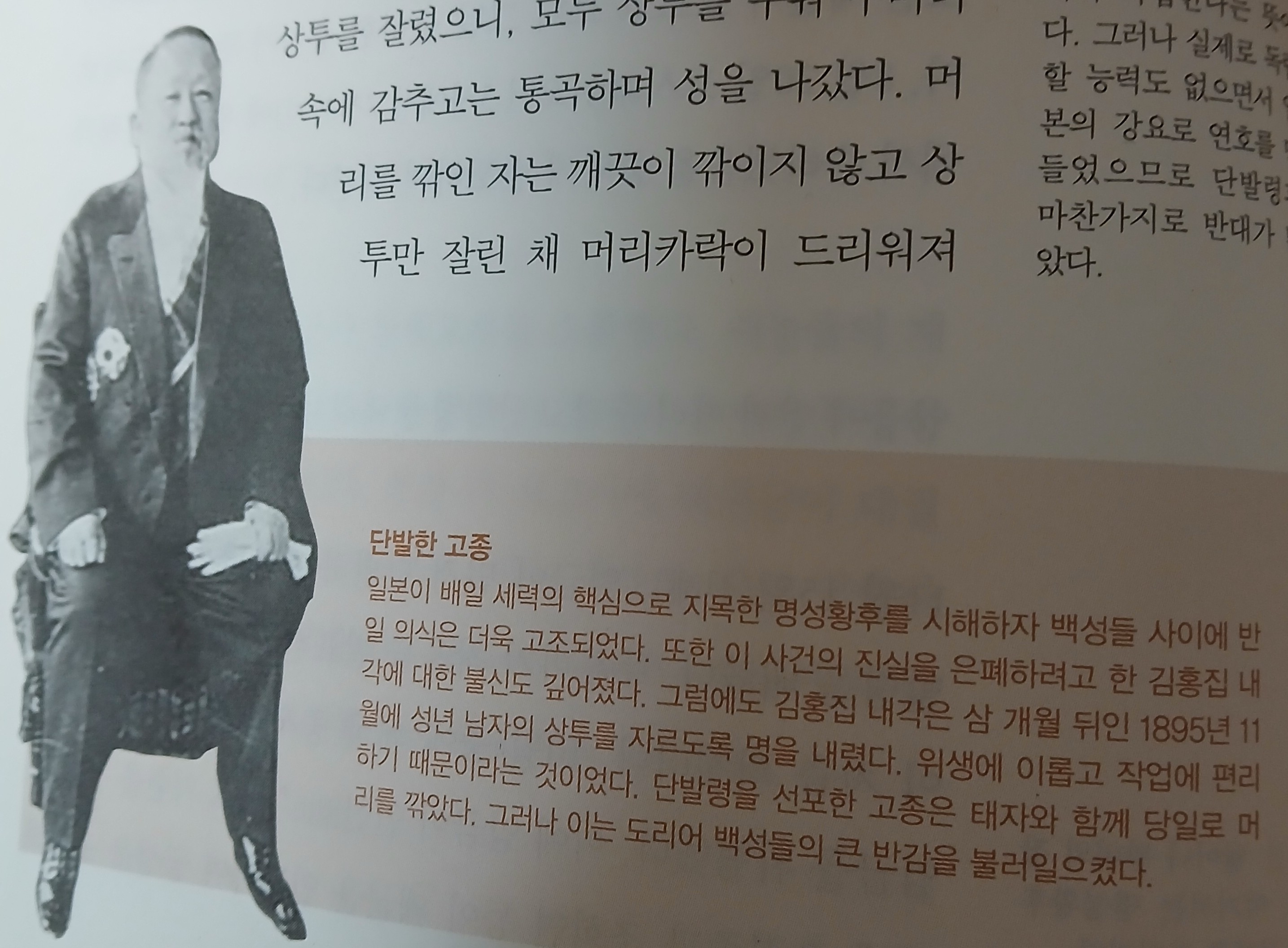 단발에 대해서도 의견이 없는 것이 아닙니다. 신의 어리석은 생각으로는, 단군과 기자 이래로 머리를 땋아 기르던 것이 상투를 트는 풍속으로 바뀌어 머리털 아끼는 것을 매우 큰일로 여기는데, 이제 하루아침에 머리를 깎게 한다면 사천 년 동안 굳은 습관을 바꾸기 어려울 것이며 만백성의 흉흉한 마음을 측량할 수 없을 것이니, 난리가 일어나지 않을지 어찌 알겠습니까?